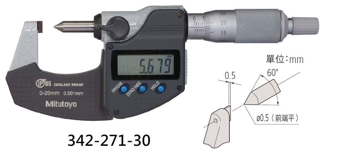 | 三豐342系列 數位式單尖頭測砧外徑測微器 IP65 | ||