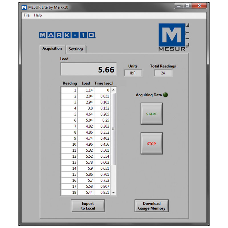 7. MESUR® Lite : 一個基本的數據蒐集軟體,將 Mark-10測力計、扭力計端所接收之數據製成表格,或匯出至 Excel 進行分析。